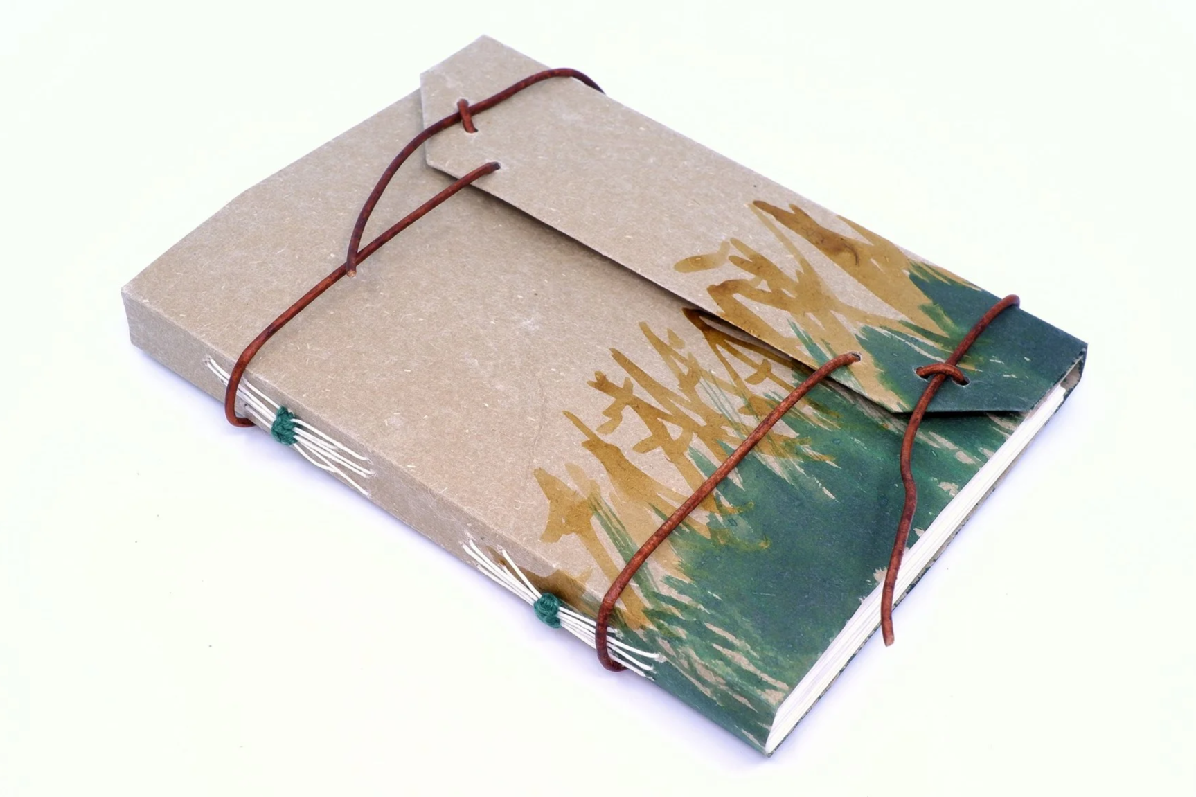 The Nemoralis is based on a Medieval record book. The limp binding is based on a 16th century registry of a town’s lumber consumption. The cover is of folded construction made from heavy paper and is held closed with a leather cord. The sections of the book are sewn directly to the cover with a unique free-form sewing pattern that includes a final gathering. Originally not created by bookbinders but rather record keepers, the technique is somewhat experimental in nature and historically would have utilized found materials.